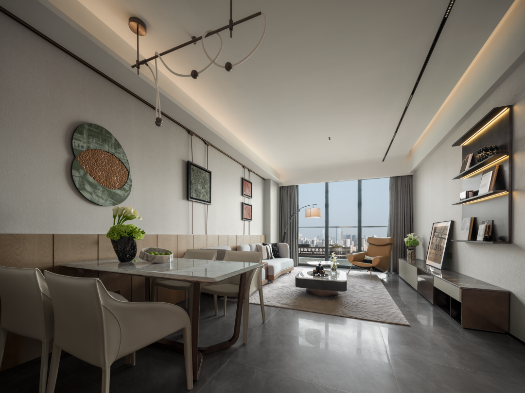 另一個37.5坪的設計,採霧面灰色大理石地板,搭配皮質軟面與木質元素,營造兩房一廳的輕奢柔和氛圍,展現材質對比的和諧之美。