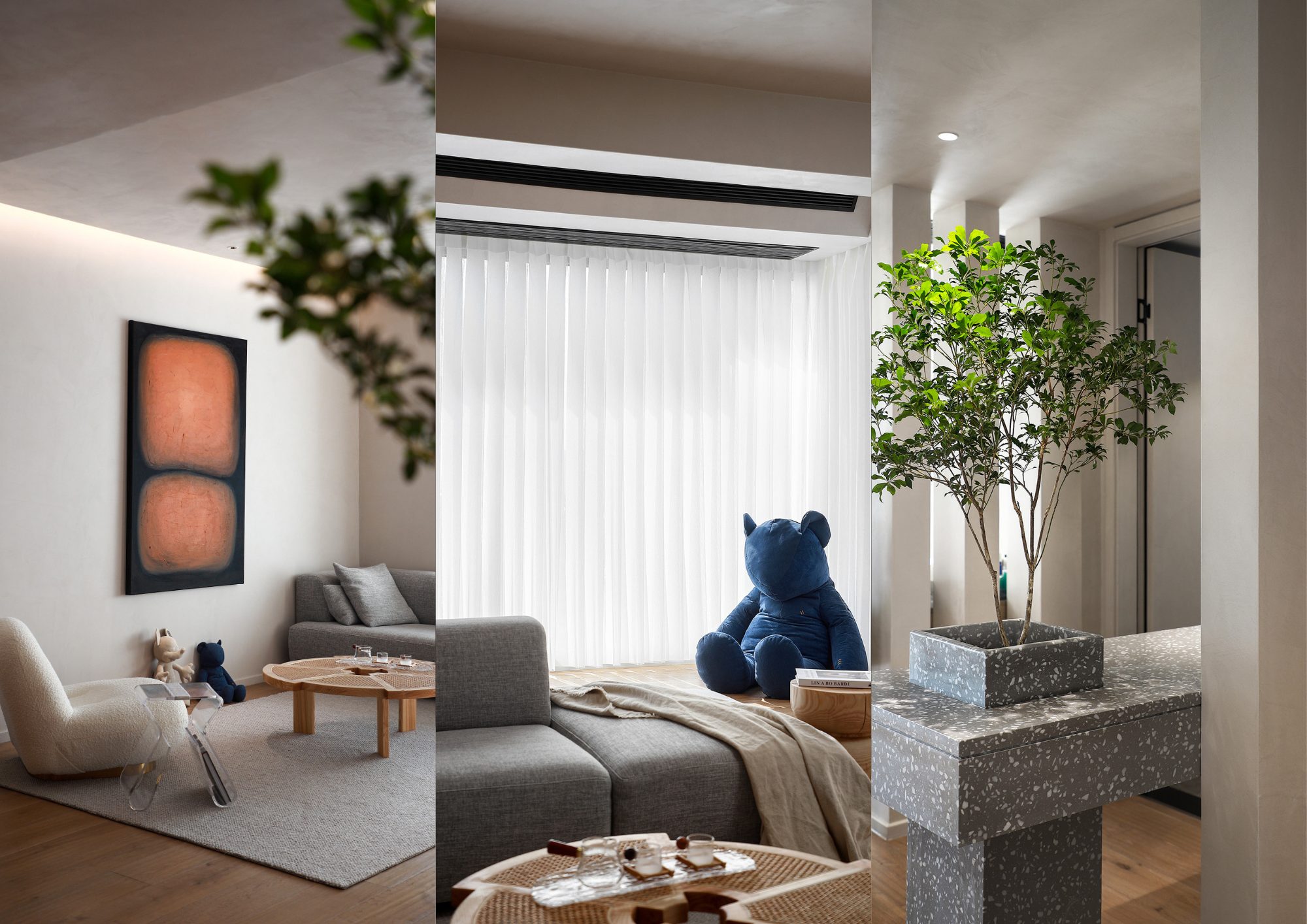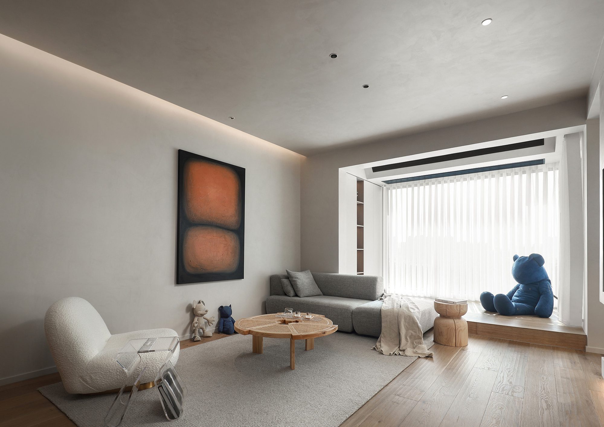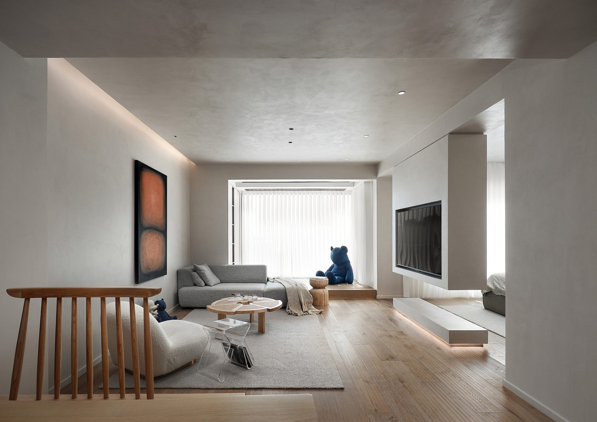 客廳設計我們化繁為簡,巧妙的將收納空間融入牆面、地板,在視覺上保留開闊舒適的空間,電視背景牆做為客廳與房間的分界,我們選擇不將其做到底,保留些許空間,使其成為半開放式空間,最大化減少壓迫感的同時還能保有區隔空間的功能。