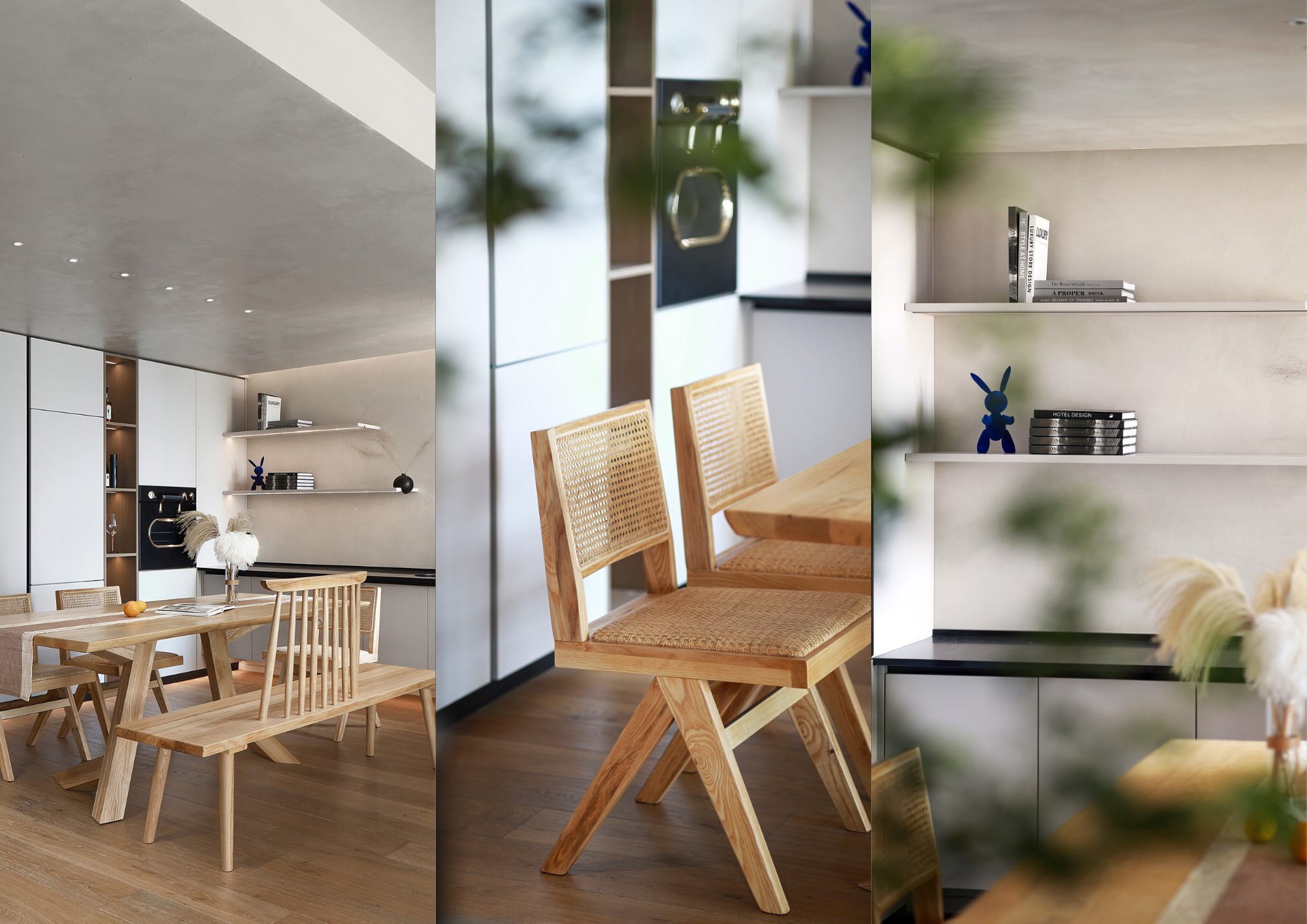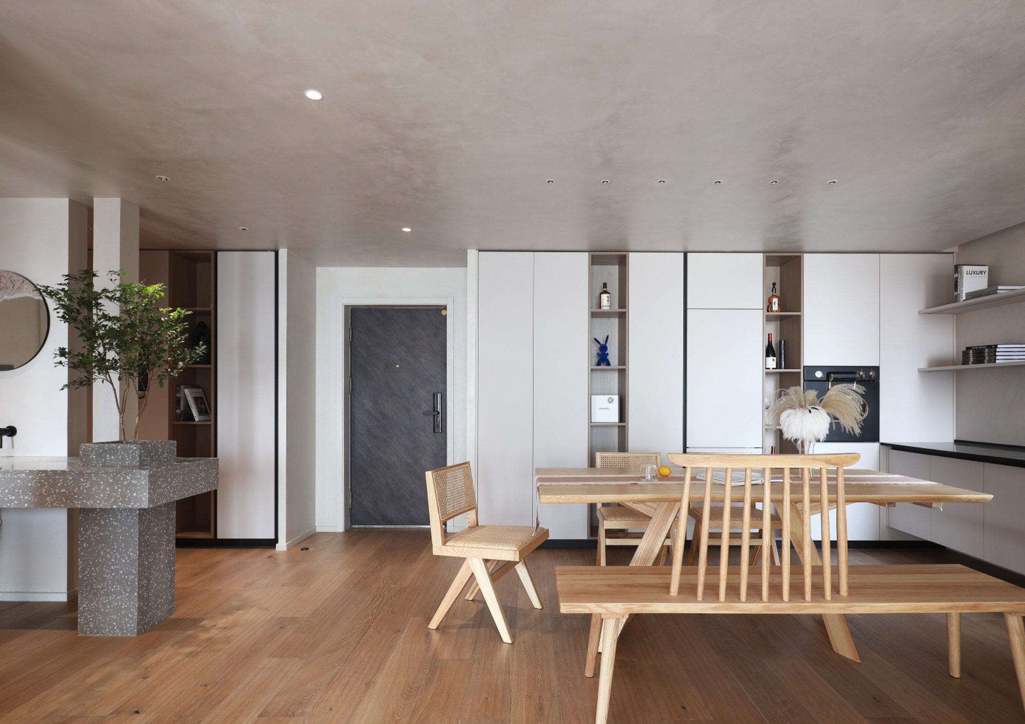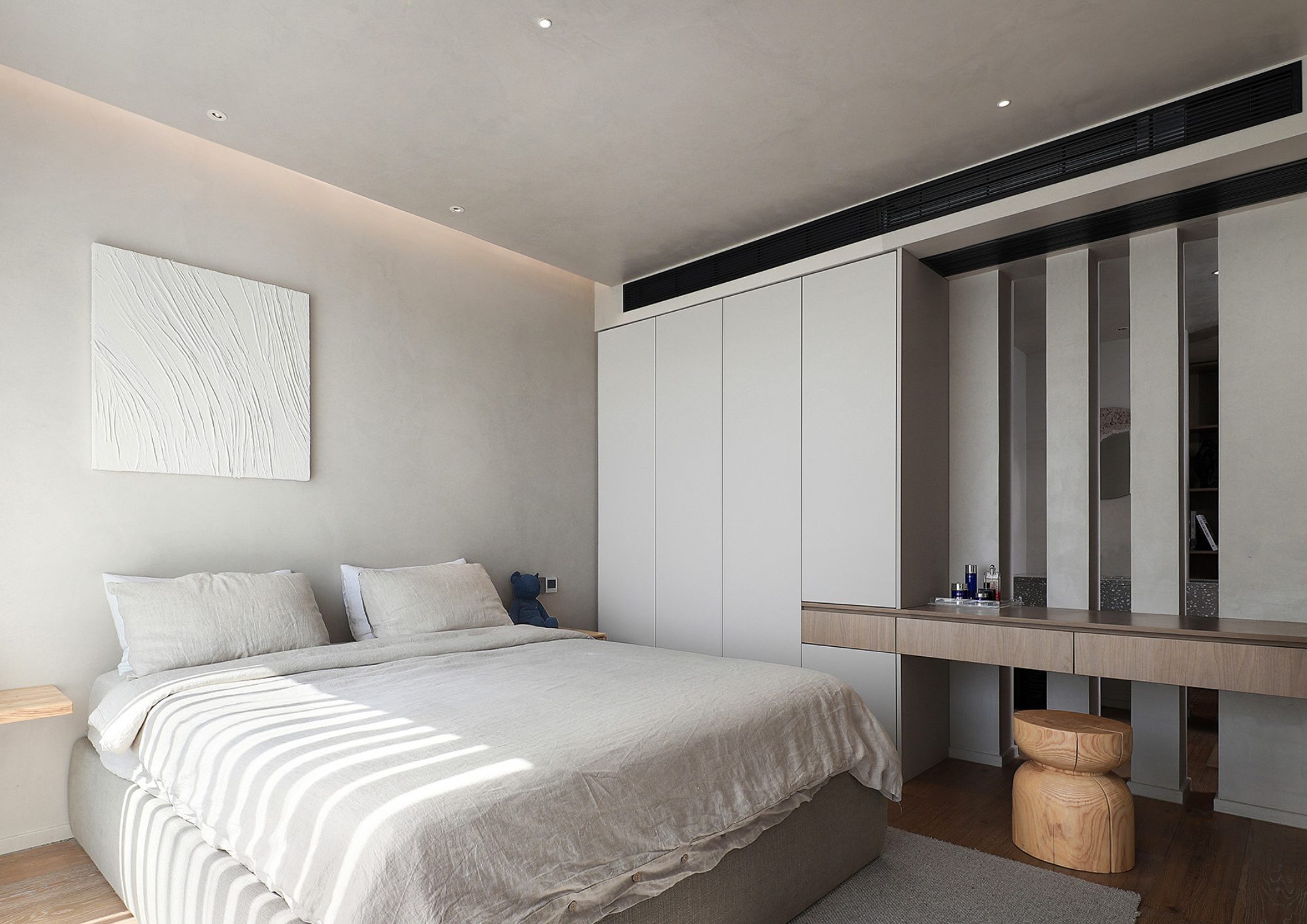 原木色與乾淨的白色相融,簡單的同時帶有完善的收納與梳妝台功能,讓空間彷彿自然形成。