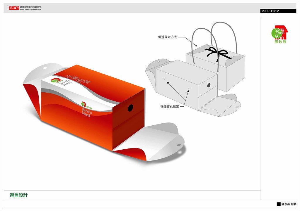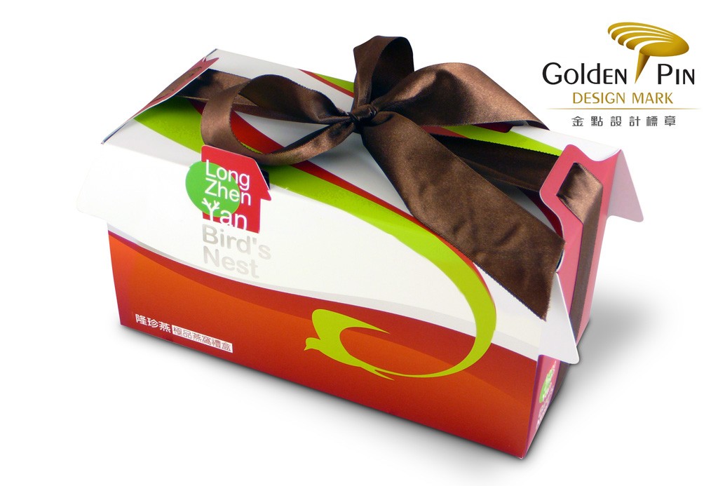 隆珍燕此系列包裝設計,靈感來自環保議題,顛覆了一般人對野生燕窩遭到濫採而衍生的問題,隆珍燕為了愛惜與保護燕子,便開始研究燕屋設計技術,十數年以來的豐富的燕屋經營經驗,養殖高品質的屋燕,並與國外業界技術合作開發燕窩系列產品,這看似枝微末節的高級補品食材,不再是傳統舊盒盒裝載著,轉化一個包裝形式,更能躍升為不平凡的極品包裝。