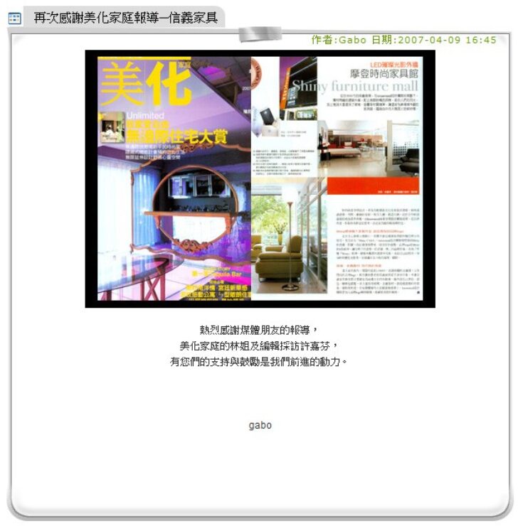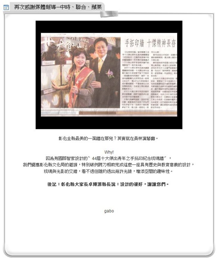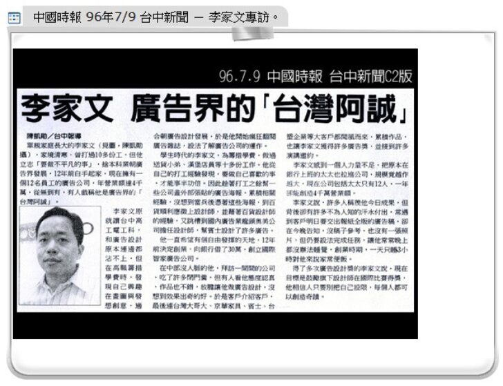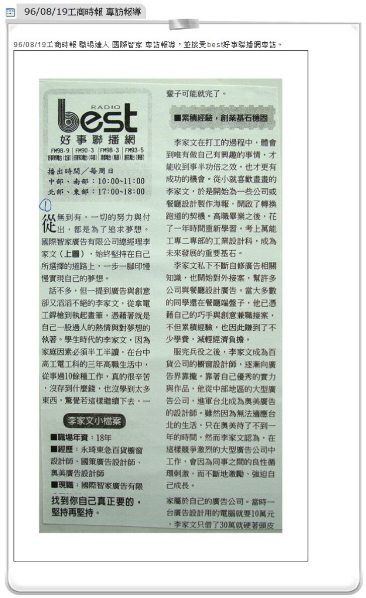 2016-06-21 02008.08-報紙及電台報導-Gabo總監專訪 2016-06-21 02007.09-報紙報導-Gabo總監專訪 2016-06-21 02007.02-雜誌報導-信義家具篇 2016-06-21 02007.01-雜誌報導-信義家具 2016-06-21 02007.01-報紙報導-員林演藝廳裝置藝術篇 2016-06-21 02008.08-雜誌報導-張公館篇 2016-06-21 02007.08-報紙及電台報導-Gabo總監專訪 2016-06-21 02007.07-報紙報導-Gabo總監專訪 2016-06-21 0【智家觀點】以小見大!品牌識別系統連貫性 圖片來源 :tonyenterprises.com 「品牌就是一個 Read more … 2016-06-21 0【設計風向球】打造強烈初印象,名片視覺設計 你我可能都曾有這樣的經驗,日常生活中,收到來自各行各業、形形色色的名片,它們被蒐 Read more … 文章分頁 上一頁 1 ... 4 5 6 下一頁